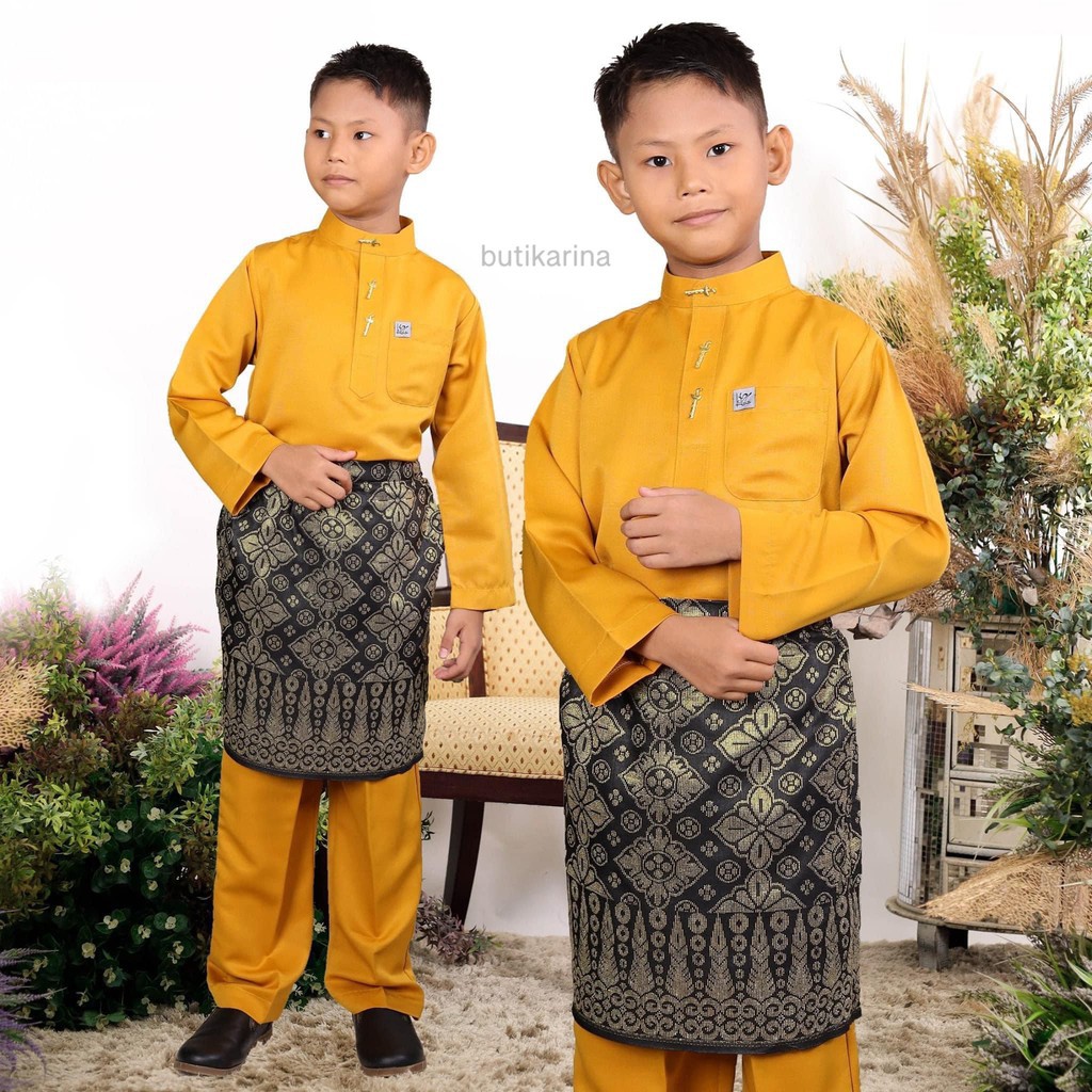Baju melayu moden slim fit yellow mustard gold kuning emas dewasa anak.